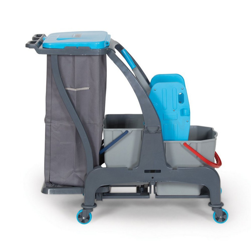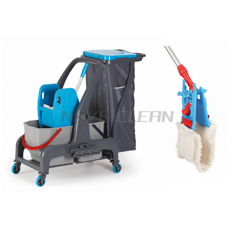 Špičkový profesionálny upratovací vozík s dvoma 25 litrovými vedrami, bočnou poličkou na mop a odpadovým košom. Robustný žmýkač na mop, pogumované kolieska a bočná polička na mop. Stal sa najobľúbenejším vozíkom kvôli svojej ideálnej veľkosti a univerzálnosti. Vhodný na umývanie chodieb, kancelárií, skladov, budov, výrobných hál... Systém bezdotykového umývania - Ak sa pri umývaní podlahy používa mop systém FLIPPER, tak sa stihne umyť oveľa väčšia plocha vďaka rýchlemu a jednoduchému žmýkaniu mopu. Vďaka tomuto profesionálnemu systému je práca s ním mimoriadne efektívna a jednoduchá, nakoľko ruky obsluhy neprichádzajú do kontaktu s mopom a vodou.